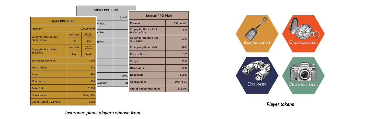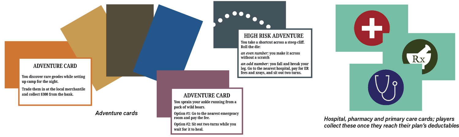 The goal was to give players a better understanding of how health insurance works and I didn’t want to cloud that initiative with the additional burden of learning a complicated set of rules. I kept the game design simple: a “race game” similar to Milton Bradley’s Life. I tested out a prototype with individual players and a few game cards to see if the concept was viable.