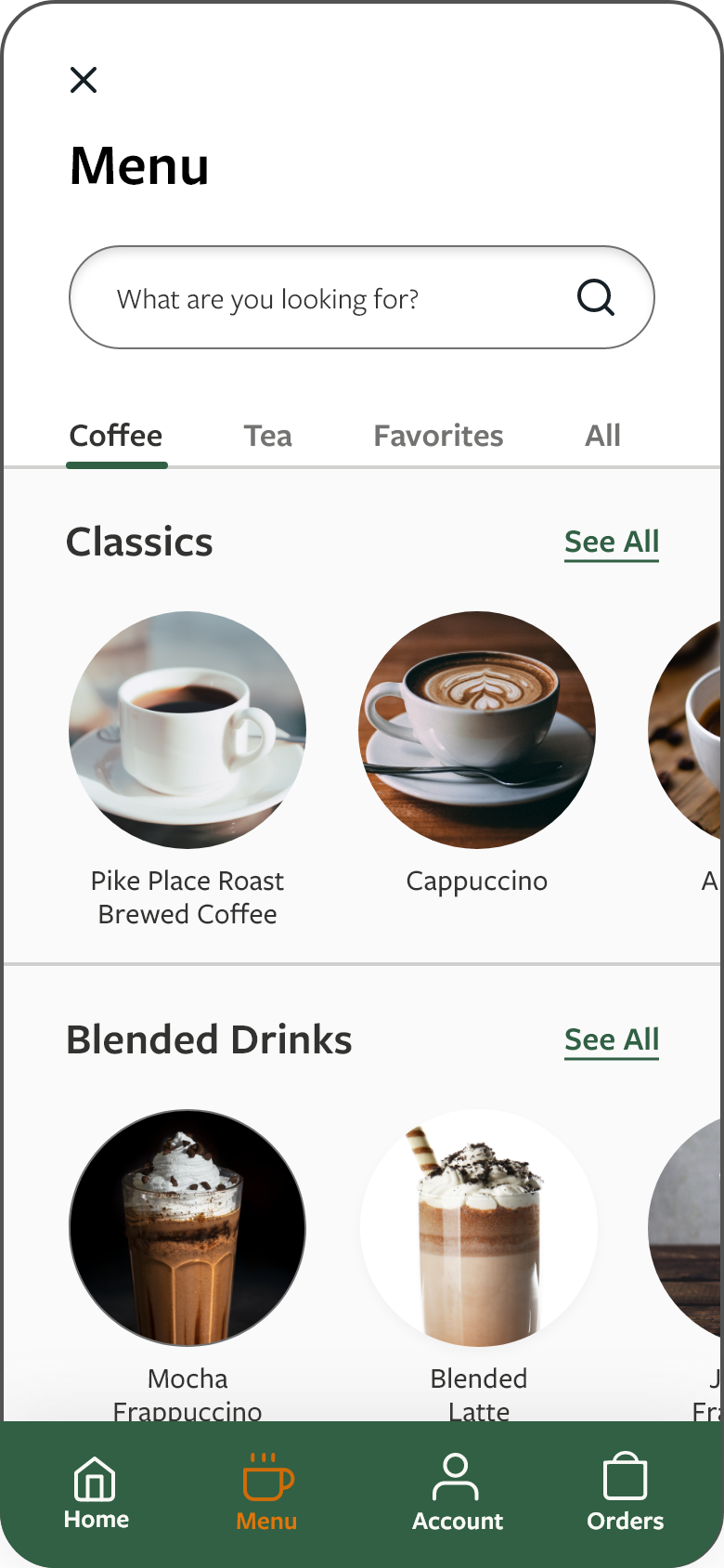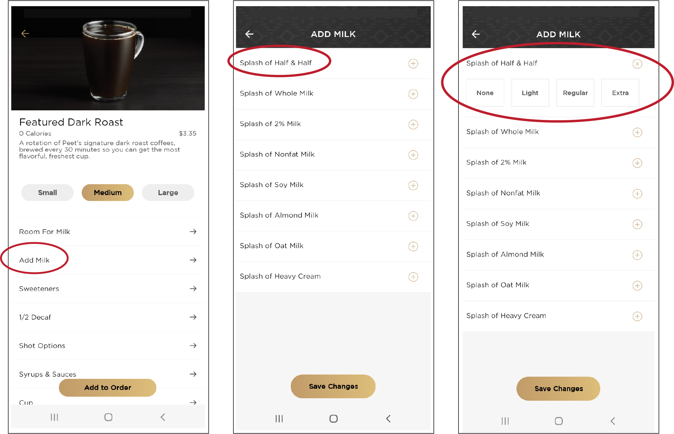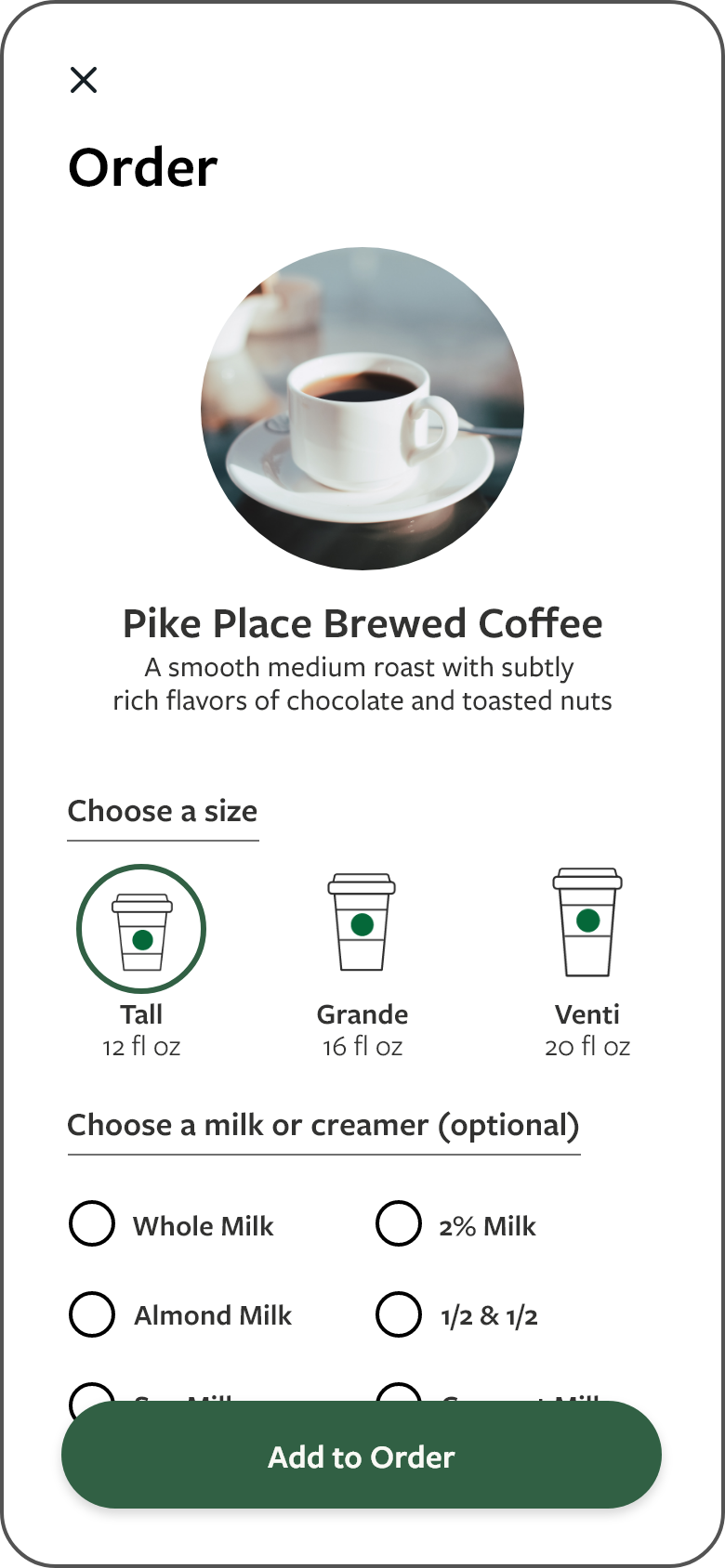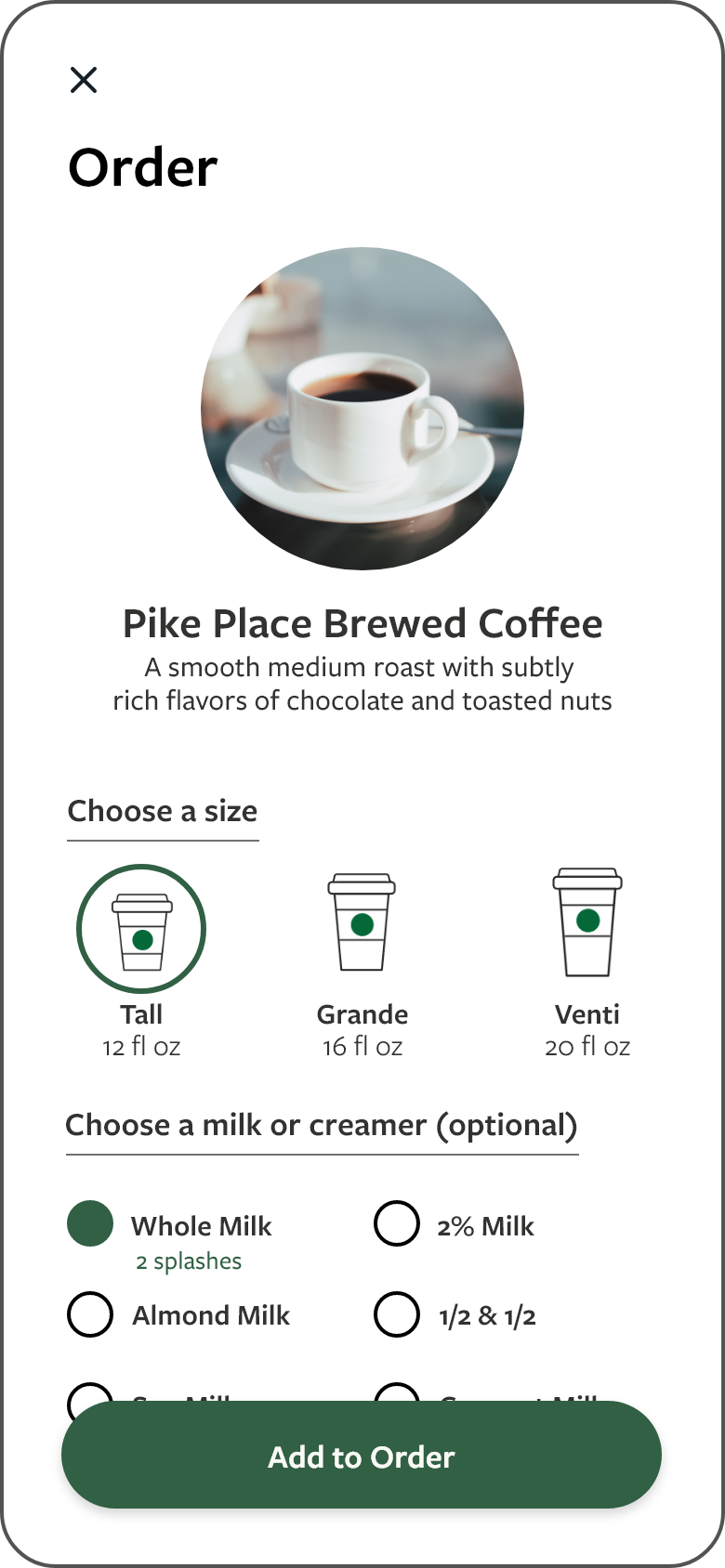 User goes from menu to order screen. After choosing a size, the user has the option to select a milk or creamer option.