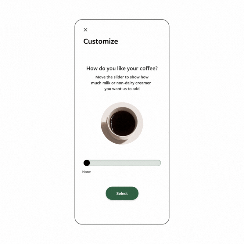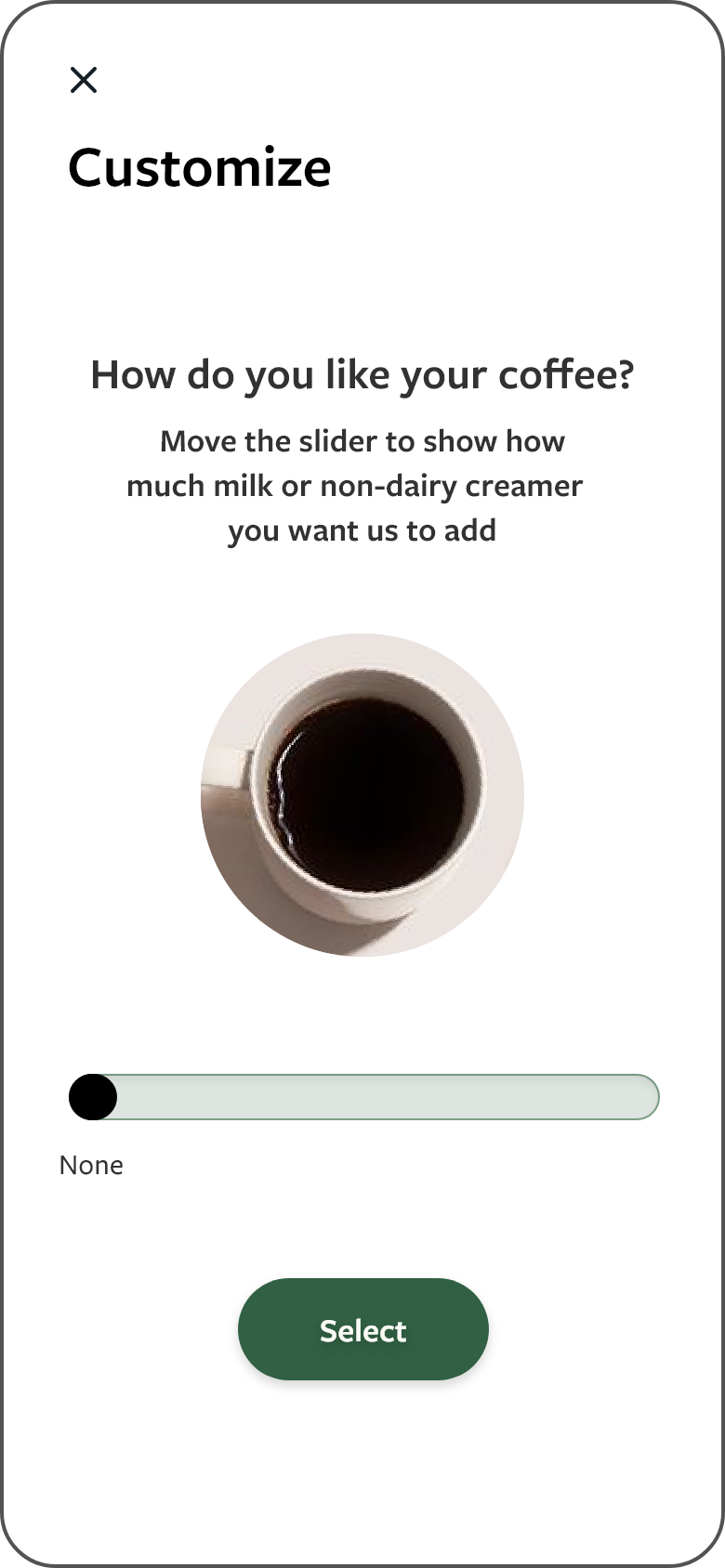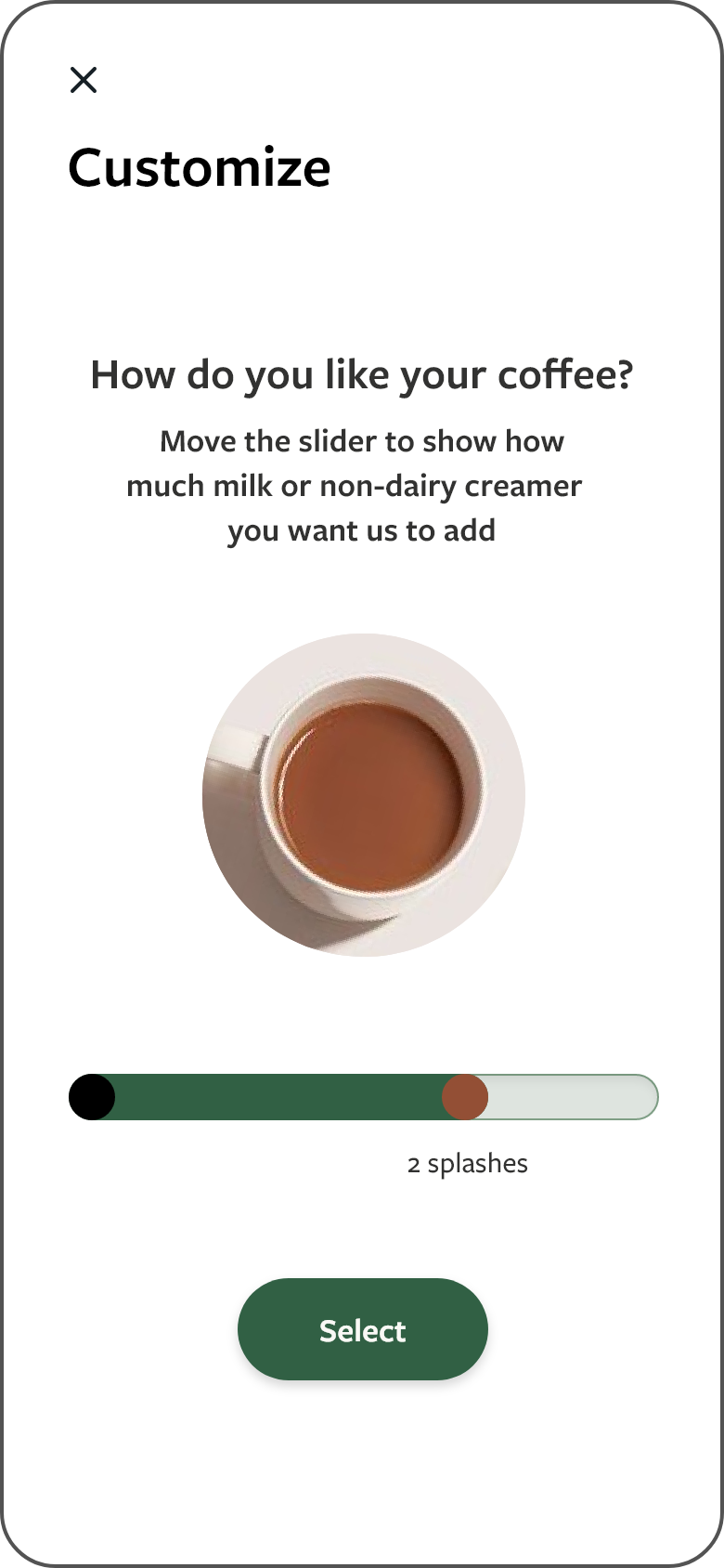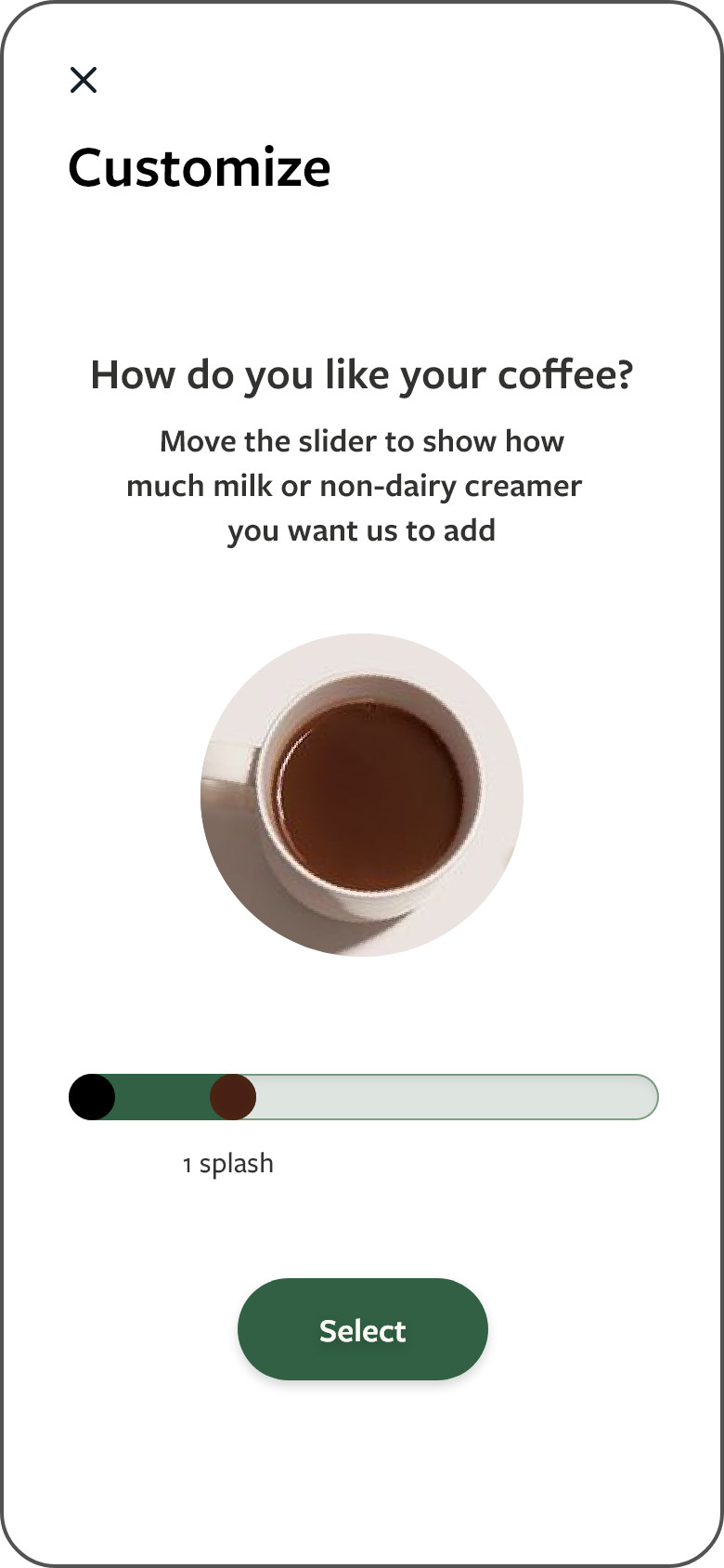 Selecting a dairy or creamer takes the user to the customization screen where the user moves a slider to see how much cream their selection will add to their coffee.